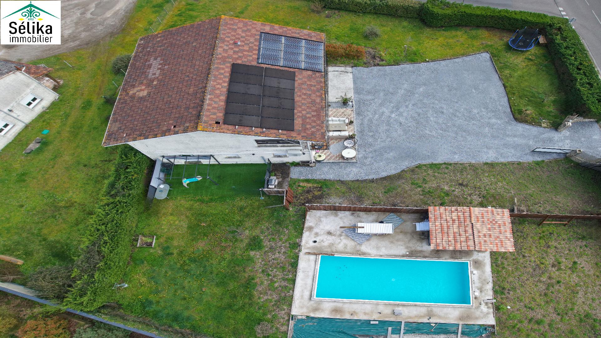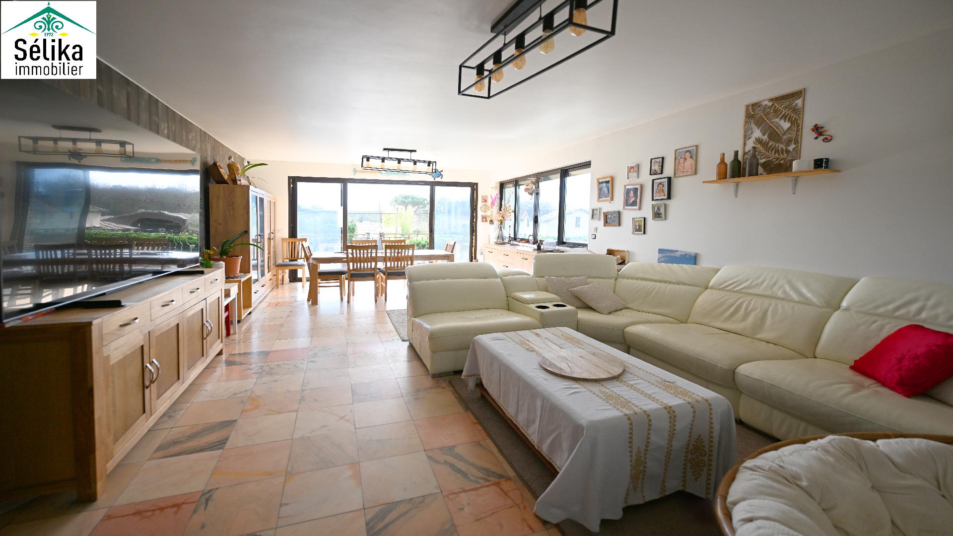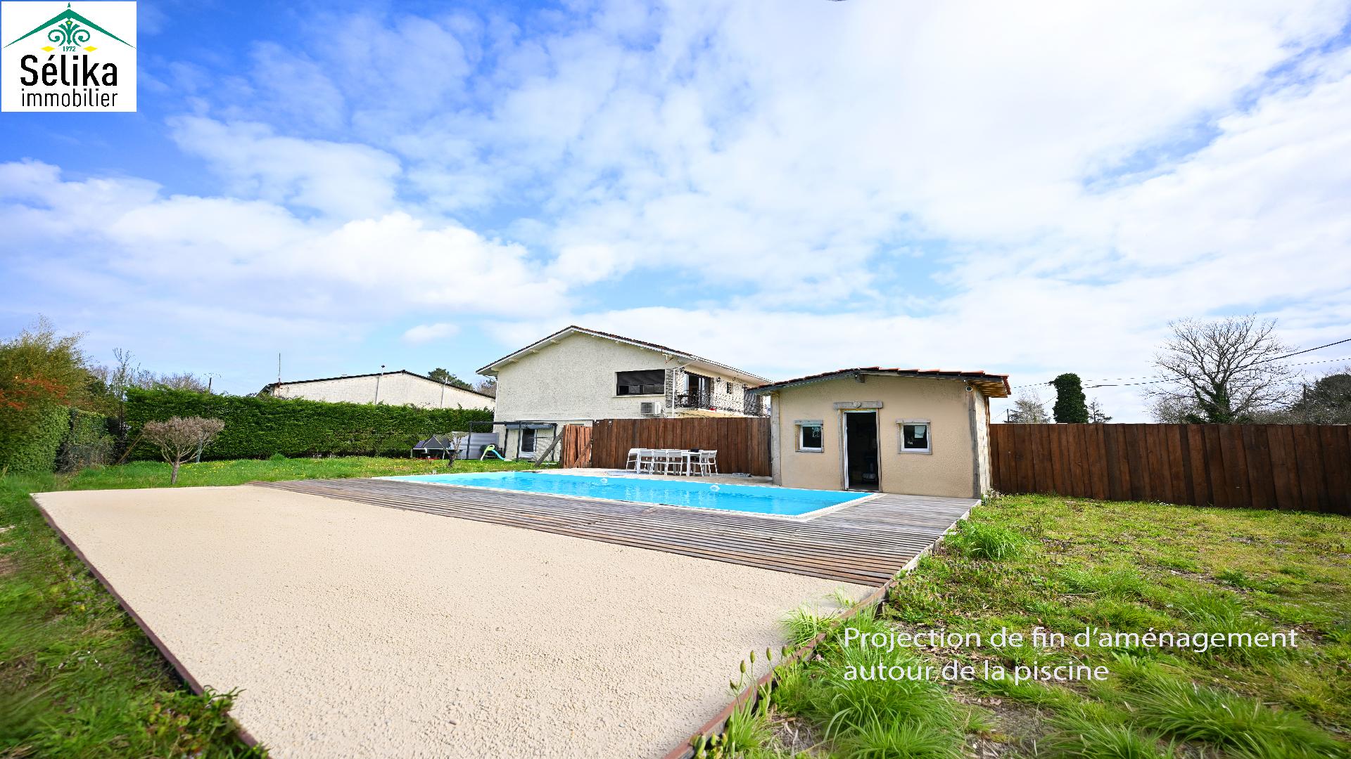 Découvrez cette grande villa idéale, pour une vie de famille ou résidence principale sur deux niveaux. En rez de chaussée un appartement T2 indépendant. Une autre pièce seule est également aménagée en chambre. Un vaste garage avec recharge pour 2 véhicules électriques. A l'étage le séjour s'ouvre plein sud sur un grand balcon avec un beau dégagement. Une cuisine séparée, 3 chambres, 1 salle de bain, 1wc séparé et de nombreux rangements complètent l'ensemble. Panneaux solaires, clim réversible par pompe à chaleur offrent confort et économie avec un très bon DPE : A ! Puit foré avec arrosage automatique. L'espace extérieur propose une piscine (10x4) avec de larges terrasses, agrémenté d'un aire de pétanque aménagé. En plus du grand jardin, de nombreuses places de parking dans la propriété offrent l'agrément de recevoir familles et amis. La photo non contractuelle depuis la piscine propose l'aménagement des travaux en cours par le propriétaire.